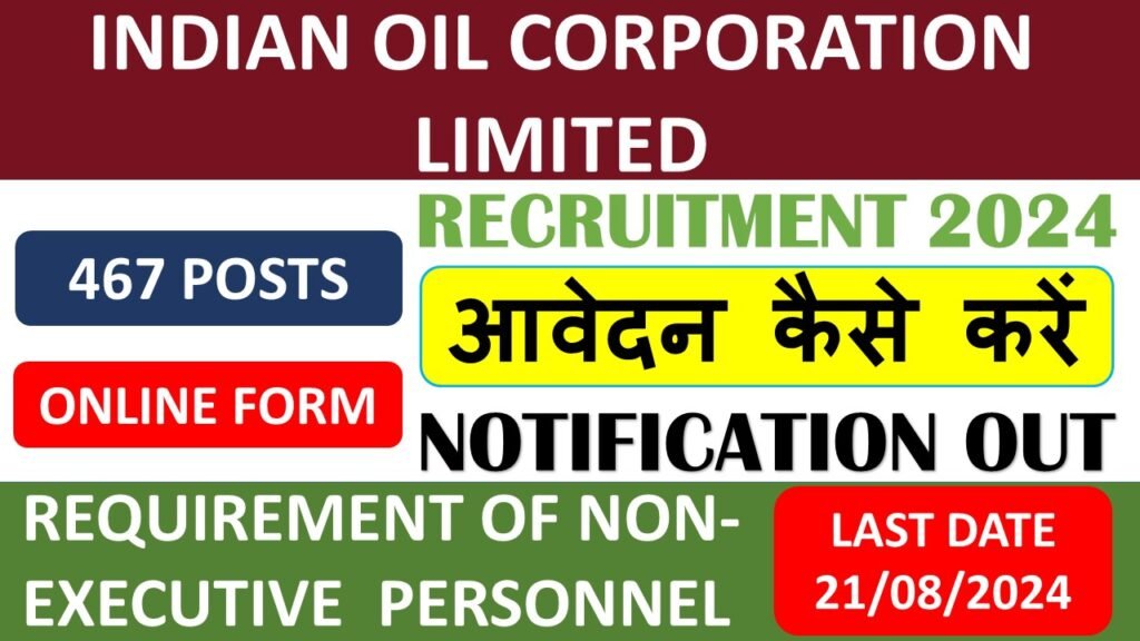 IOCL Recruitment 2024:-Indian Oil Corporation Limited (IOCL) has released a notification on its official website i.e. https://iocl.com/. As per the notification IOCL will fill total 467 Posts for various department against the “Requirement of Non-Executive Personnel” in the Refineries & Pipelines Division.
